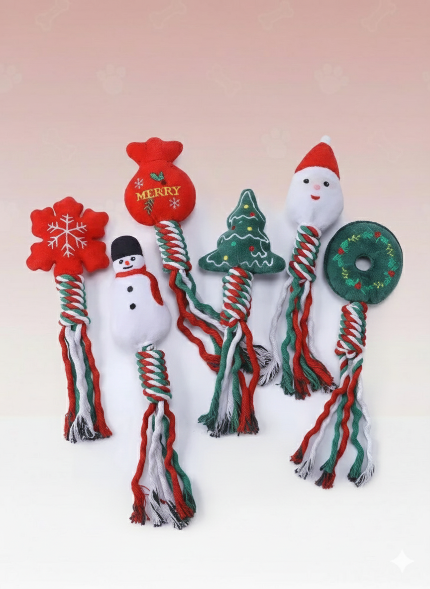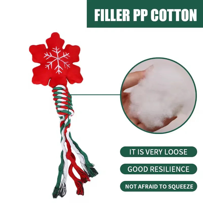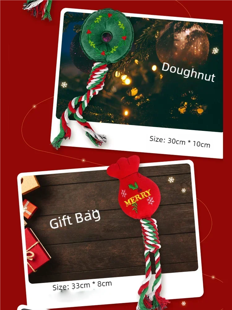 🎄It features a cute plush shape like a Christmas tree, Santa,garland, snowman ,snowflake or lucky bag, combined with a durable chew rope.